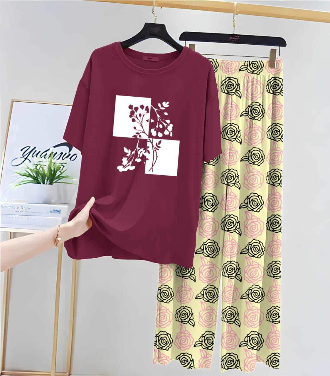 Burgundy Bloom Tee & Rose‑Print Lounge Set