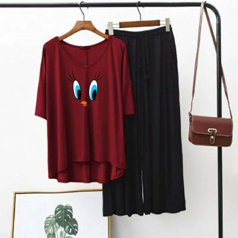 Daffy Duck Printed Love Heart Printed Red V Neck T shirt with Black Palazzo Pajama Night Suit